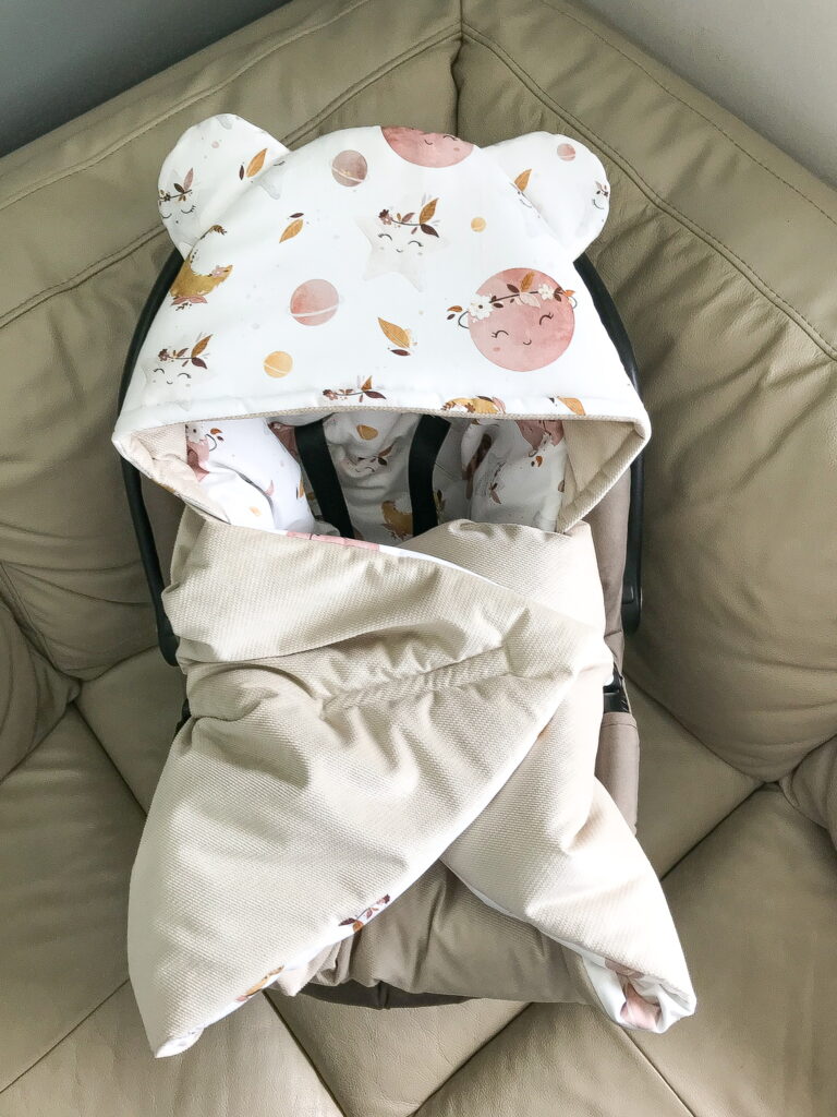 Kocyk dostosowany do trzypunktowego lub pięciopunktowego systemu pasów, otuli twoje dziecko podczas podróży. Nie musisz wybudzać go ze snu, jest wygodny i mięciutki. Posiada kapturek z uroczymi uszkami. Dodatkowo jest wszyty rzep, dzięki niemu bobas się nie odkryję.